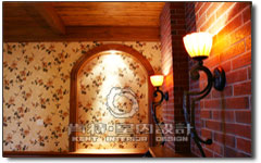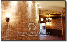 此方案设计给人以古典与浪漫温馨的感觉。墙壁选用大量复古风格的瓷砖和壁纸。波浪形天花板凸显其古典浪漫的特色风格。
