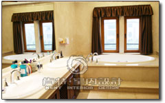 在卫生间的设计中,设计师使用了靓丽的大理石,配上洁白的浴缸,使人在沐浴时得以彻底的放松。浴缸旁边选用了由我们设计定做的实木柜配大理石台面的洗手台。 |